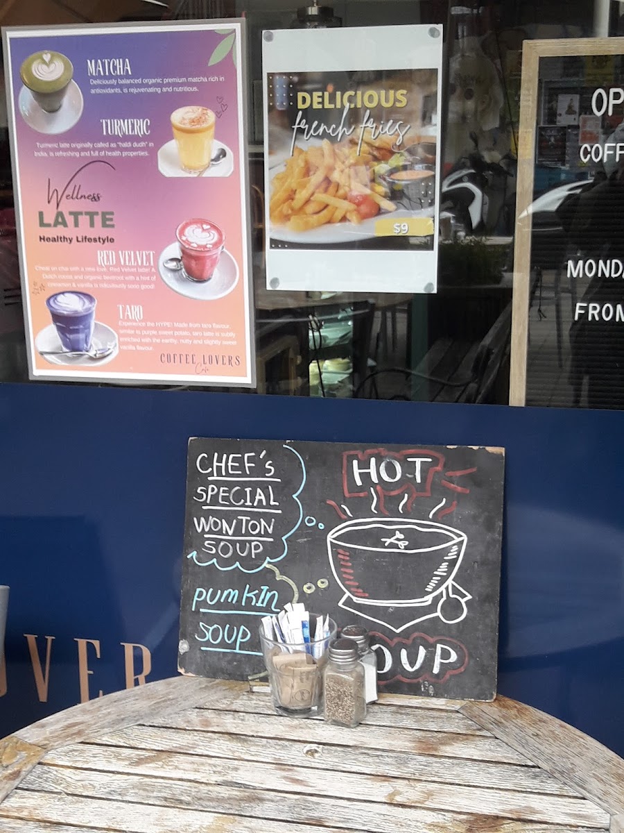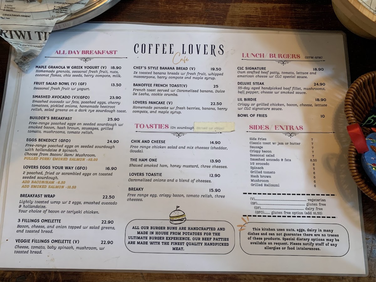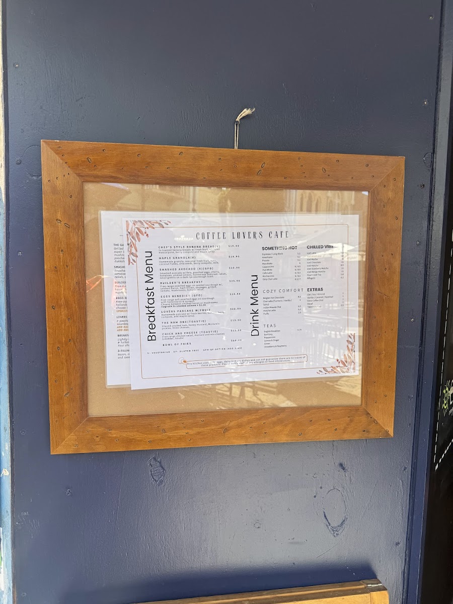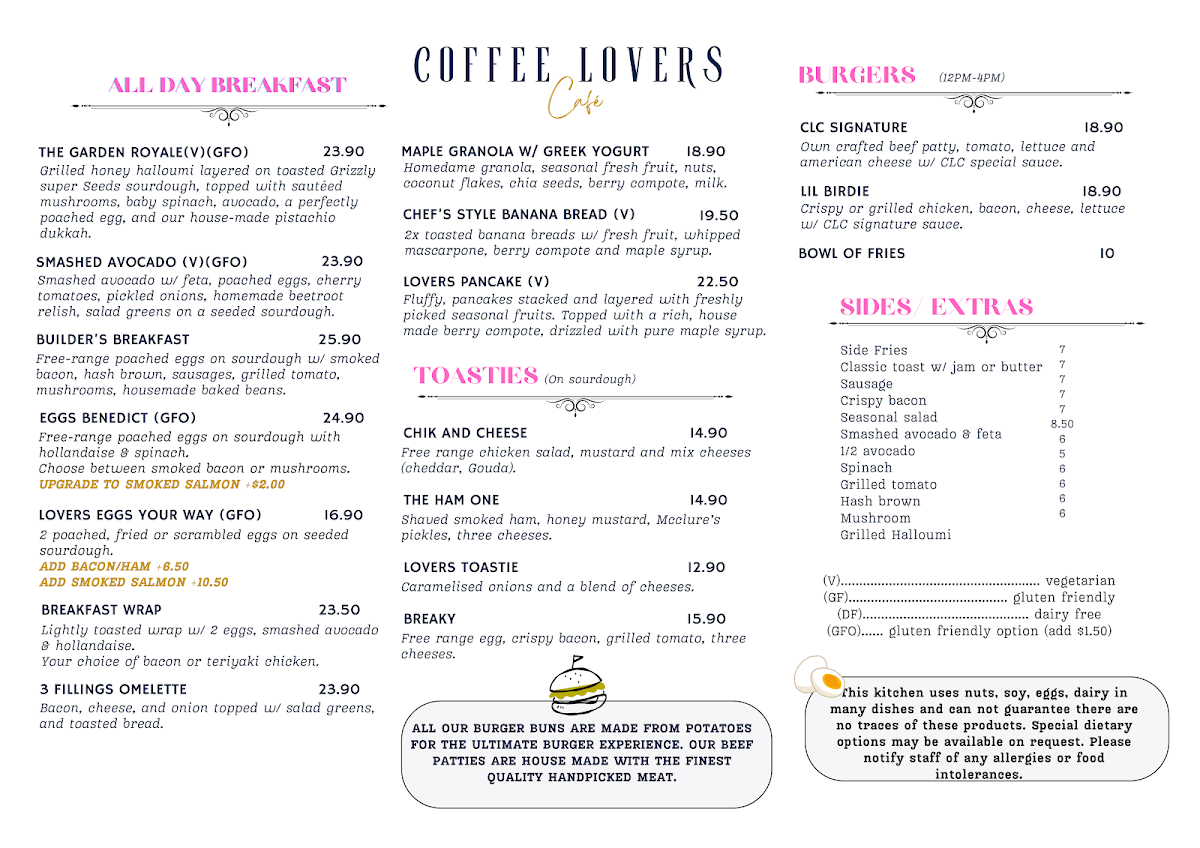 The menu at Coffee Lovers Cafe is designed to cater to breakfast, lunch, and coffee breaks with a variety of options suitable for different times of the day. It offers a range of hot beverages alongside an assortment of food items structured into several categories.